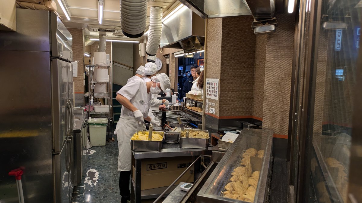 その匂いを辿っていくと、お店の前で立ち止まる人々の姿がありました。赤提灯と木の看板が目印のその場所からは、職人さんがテンポよく手を動かす姿がガラス越しに見えます。