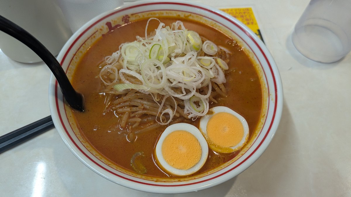 目の前に運ばれてきたどんぶりには、真っ赤なスープと、こんもりと盛られた新鮮なネギ、そして綺麗にスライスされたゆで卵が彩りを添えています。まずはスープを一口いただくと、ただ辛いだけではない、味噌の奥深いコクと野菜の甘みが口のなかに優しく広がっていきました。