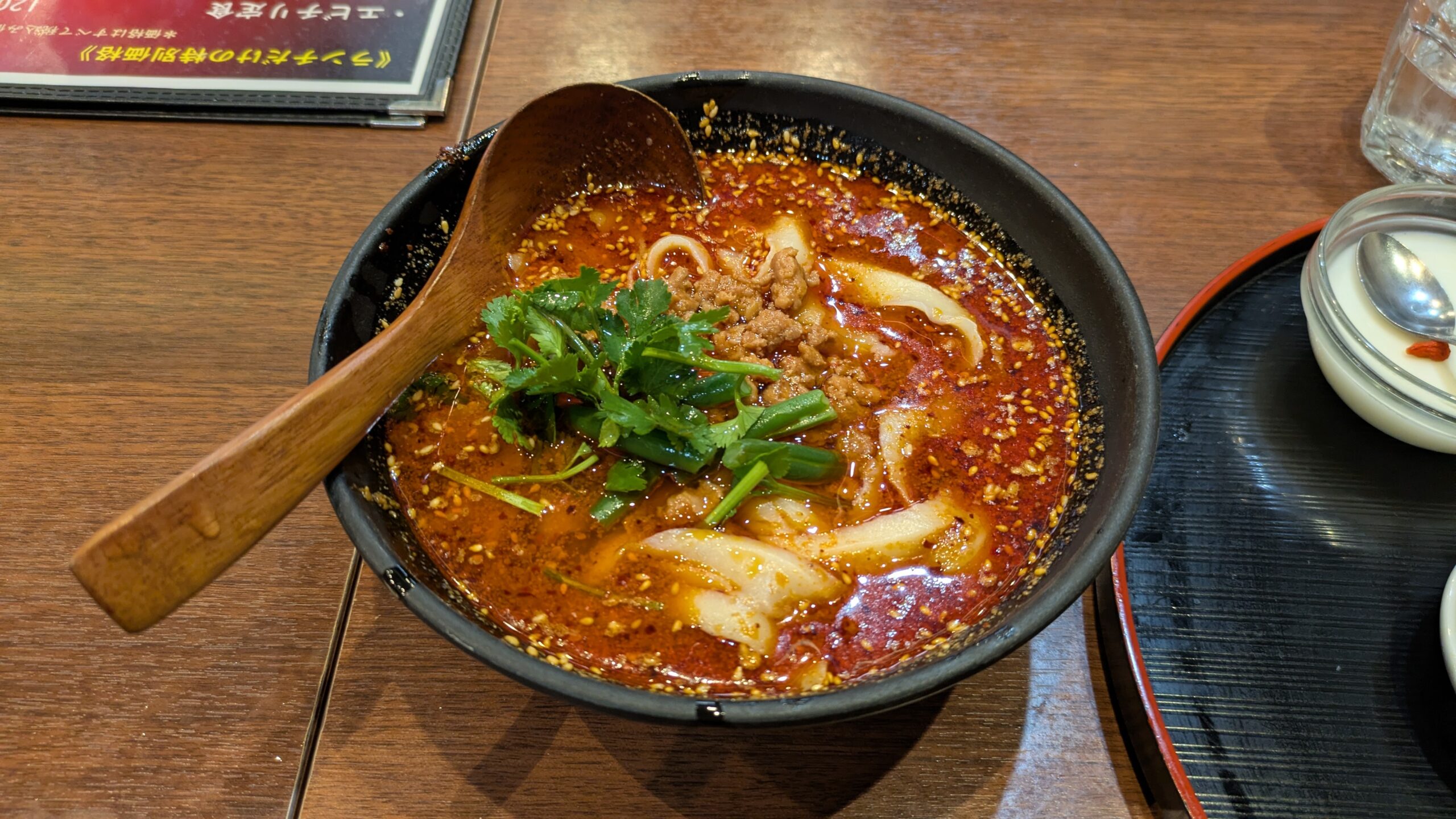 メニューには色々な種類の刀削麺が並んでいて、少し迷いましたが、人気No.1と書かれた「麻辣刀削麺」をお願いすることにしました。辛いものは好きですが、得意というほどでもないので、辛さは控えめでお願いできるか尋ねると、快く応じてくれました。