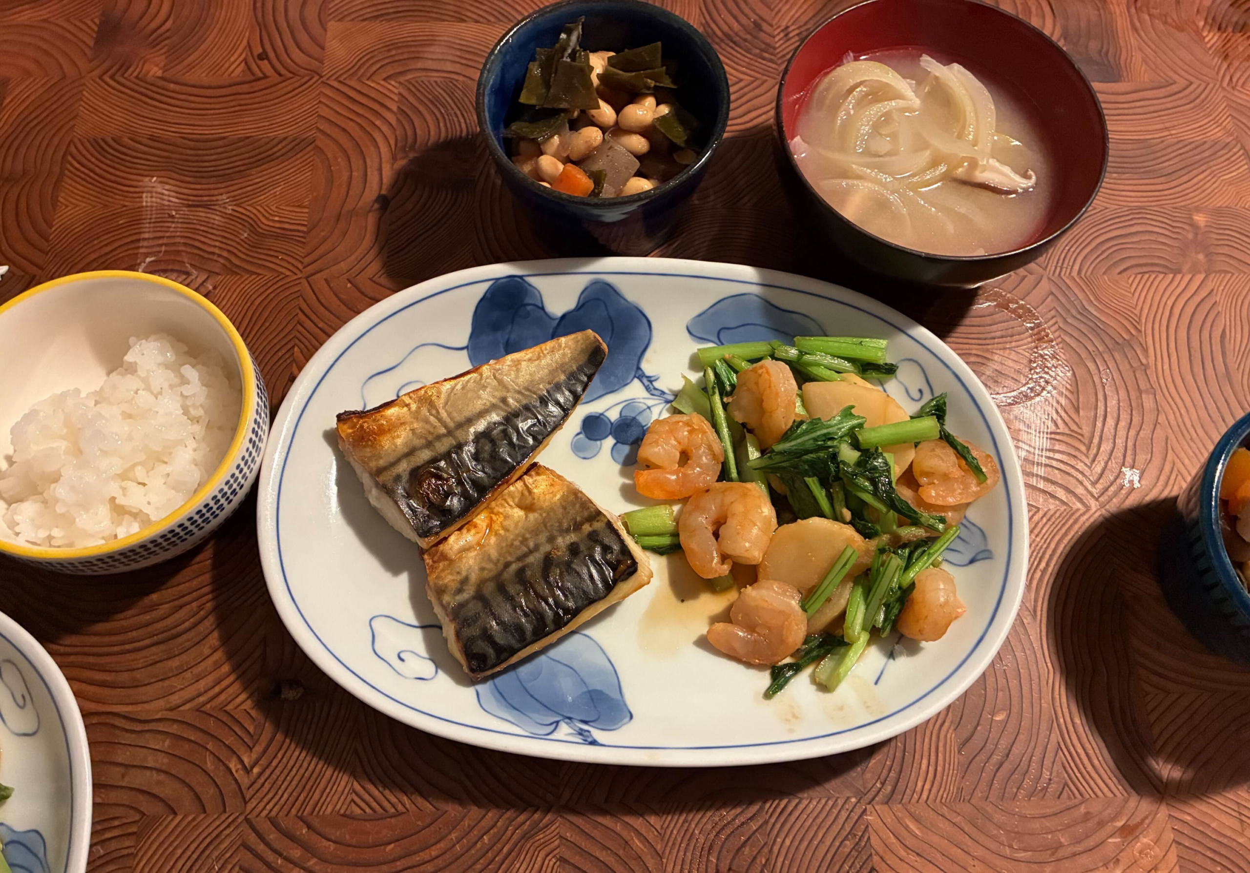 そして、今日の主役は鯖の塩焼き。魚焼きグリルで焼いていると、ぱちぱち、という音とともに香ばしい匂いがキッチンに広がります。皮はぱりっと、身はふっくら、じゅわっと脂がのっていて。大根おろしを少し添えるだけで、さっぱりといただけます。