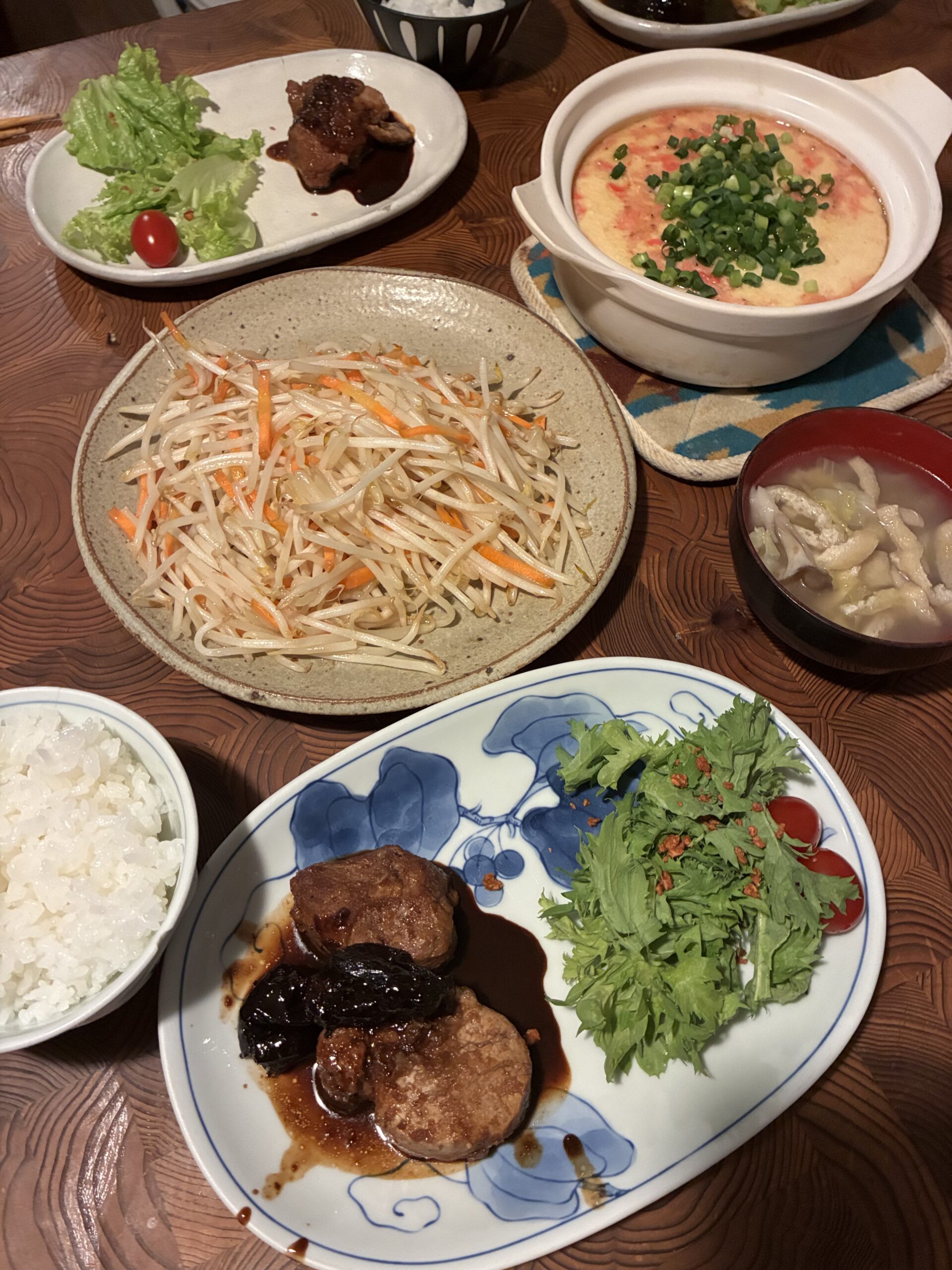 ほかほかの白いごはん、ふるふるの茶碗蒸し、そしてお豆腐と白菜の優しいお味噌汁。主役の隣に、いつもの仲間たちが並ぶと、食卓は一気に温かい空気に包まれます。