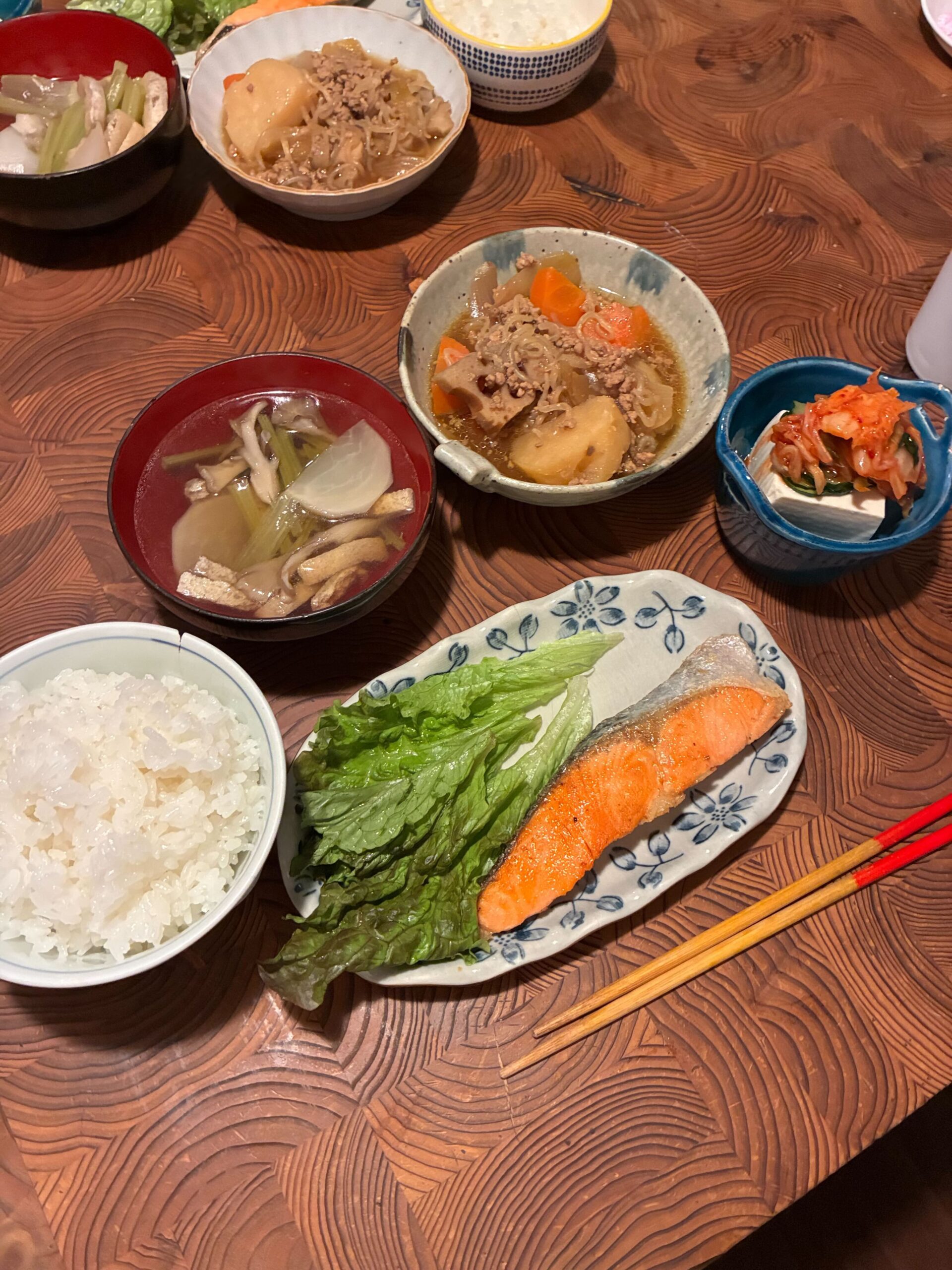 焼き鮭や肉じゃが、お味噌汁などが並んだ温かみのある和定食