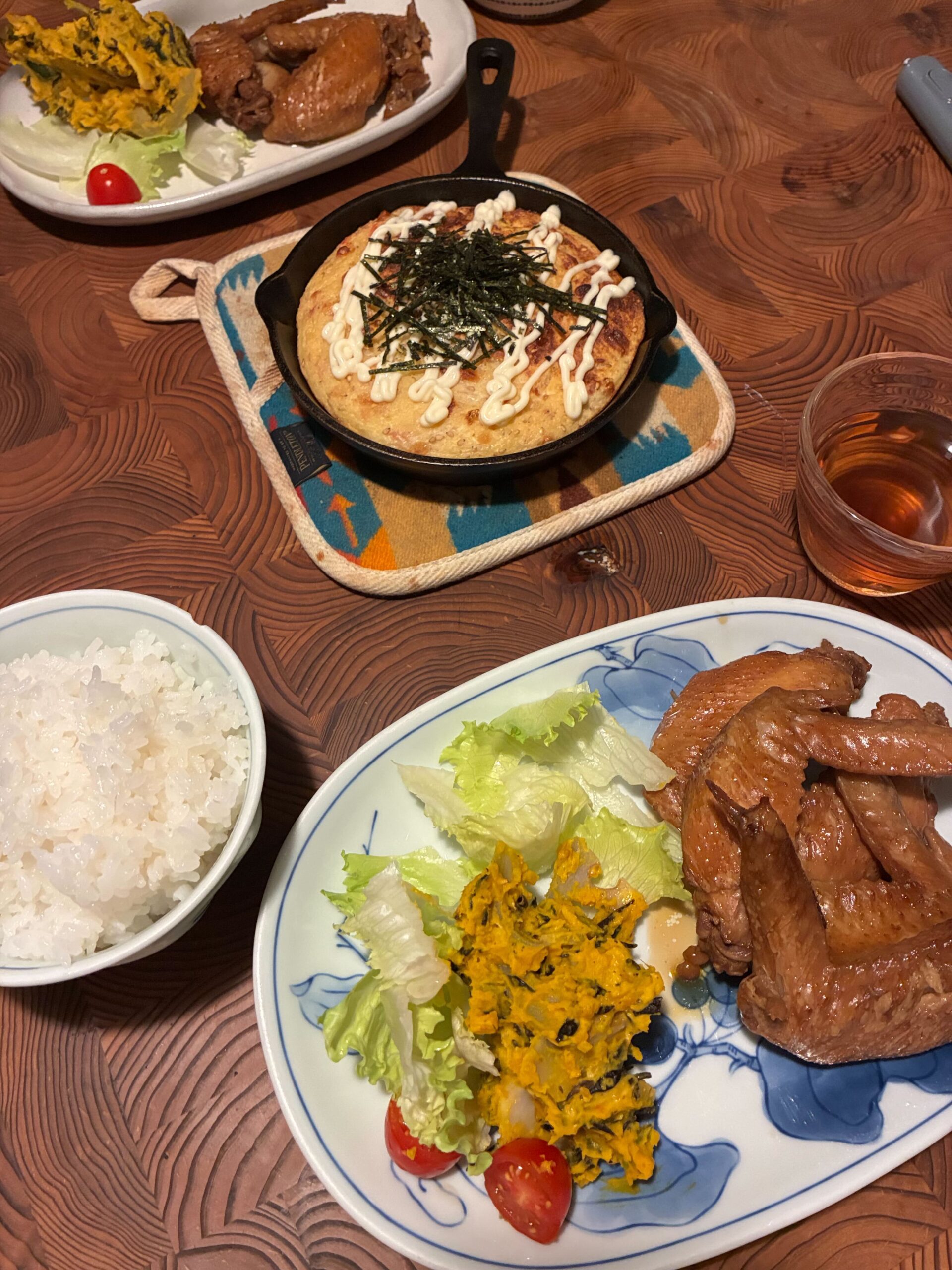 手羽元の煮込み、かぼちゃのサラダ、スキレットに入った山芋鉄板が並ぶ、温かい雰囲気のおうちごはんの食卓